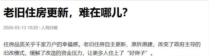 最近东谈主民日报兼并天连发两篇雄文,一篇《老旧住房更新,难在哪儿?》,一篇《老旧住房若何终了自主更新、原拆原建?记者多地看望》。一破一立、一问一答、直指中枢。